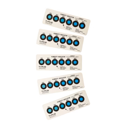 Los indicadores de humedad más comunes utilizan sales especiales que reaccionan con la humedad del ambiente. Estos vienen en forma de tarjetas con puntos circulares que cambian de color según el porcentaje de humedad al que están expuestos.